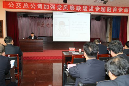 為切實(shí)履行黨委黨風(fēng)廉政建設(shè)主體責(zé)任,提高各級(jí)黨員干部的拒腐防變意識(shí),總公司黨委于3月25日在丁家屯車(chē)場(chǎng)會(huì)議室進(jìn)行了題為“加強(qiáng)黨風(fēng)廉政建設(shè),推進(jìn)唐山公交健康有序和諧發(fā)展”的廉政教育專(zhuān)題黨課,由黨委書(shū)記、副總經(jīng)理夏保良主講??偣救w班子成員、中層干部以及所屬各單位科隊(duì)長(zhǎng)以上干部,計(jì)三百余人接受了廉政教育。黨課由黨委副書(shū)記、紀(jì)委書(shū)記客林榮主持。